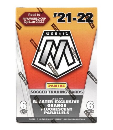 Blaster Box oficial de Panini Mosaic Road to FIFA World Cup 2021/22 con 6 packs y 6 cartas por pack. Incluye Silver y Mosaic Parallels, con posibilidad de encontrar Orange Fluorescent Parallels exclusivos y autographs de estrellas del fútbol mundial.